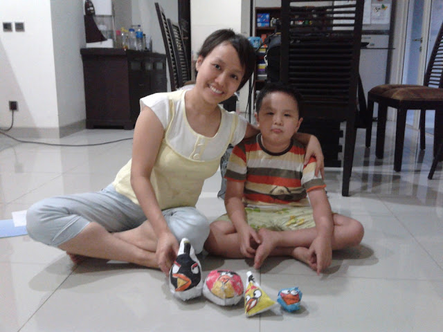 This was when we were in a toy store.... Timmy pretended that he was the big red Angry Bird, and I became the piggy Angry Bird and the boy in the Angry Bird T-shirt attacked me... Arrgh! Hahaha...